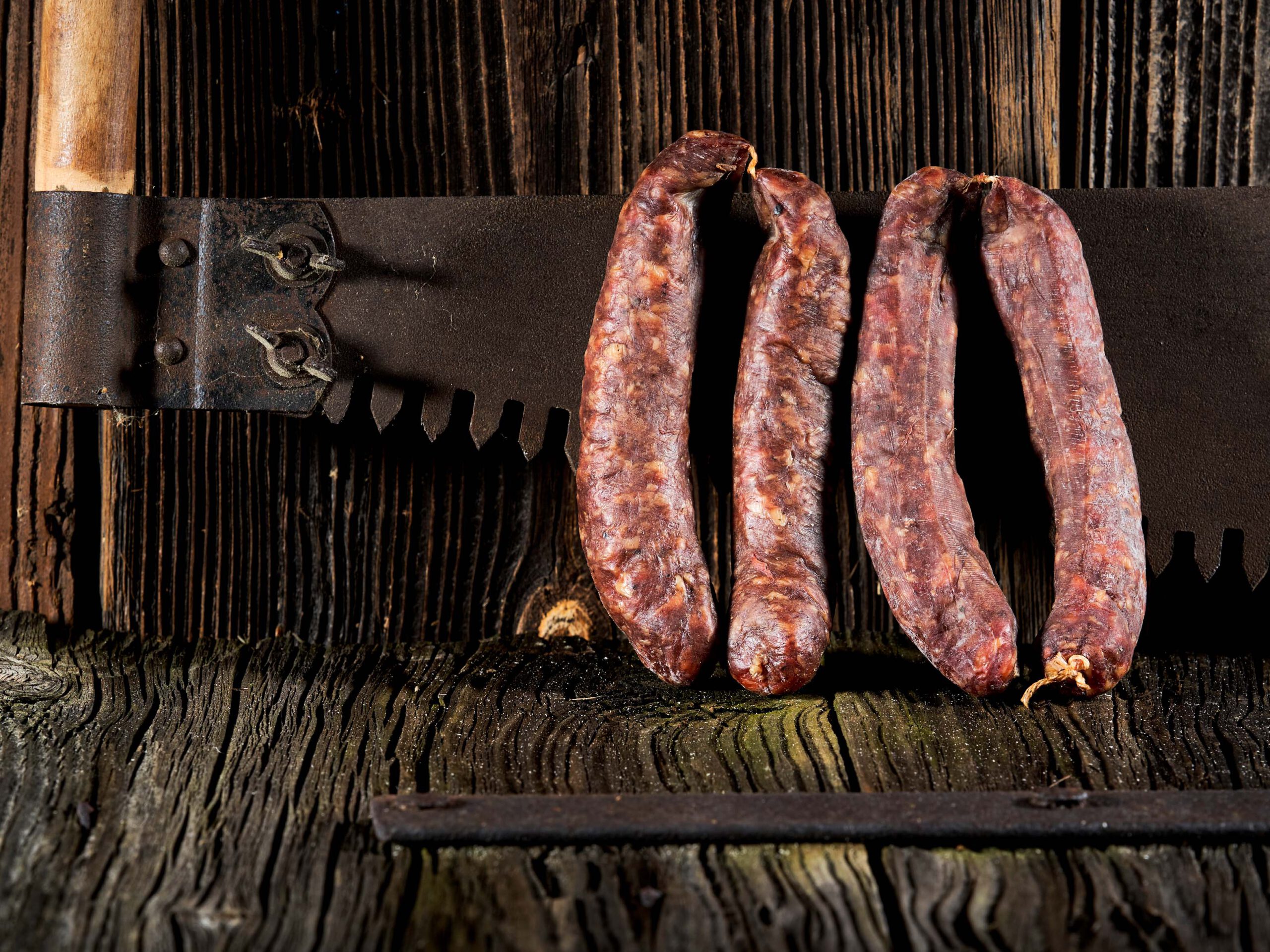 getrocknet und mit Buchenholz geräuchert. Nach diesem Selchvorgang werden sie noch max. eine Woche gelagert und luftgetrocknet, bis sie ihre typisch knackige Konsistenz erhalten.
