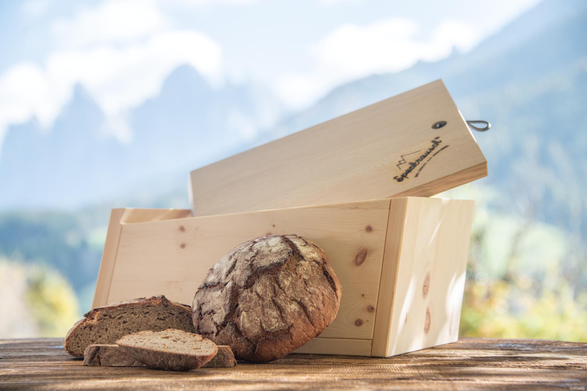 Brotkasten aus Zirbenholz mit Schneidedeckel aus Eiche massiv und Ledergriffschlaufe.
